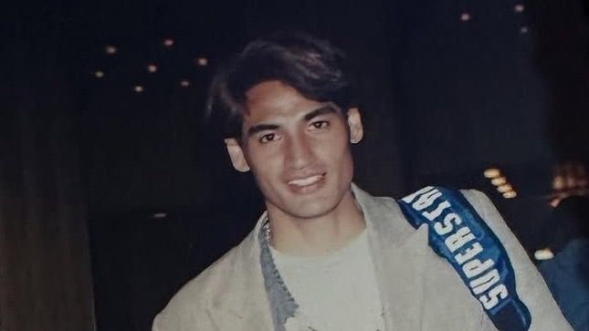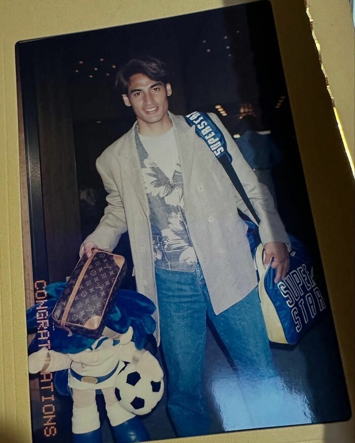 ジーンズにグレーのジャケット姿でルイ・ヴィトンのバッグを持ち、肩には「SUPER STAR」と書かれたバッグをかけている若かりし日の本並さん。