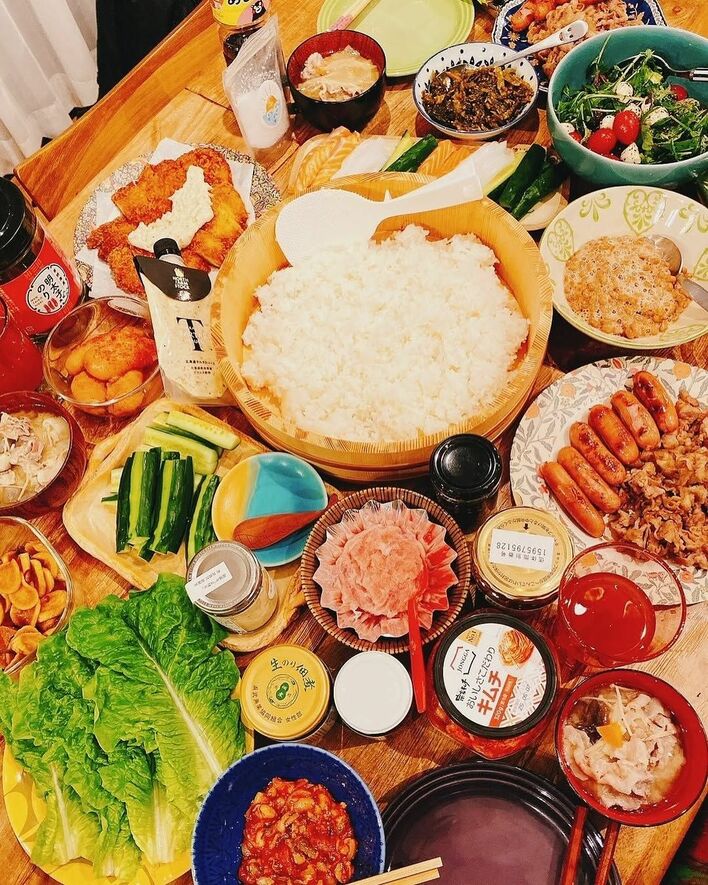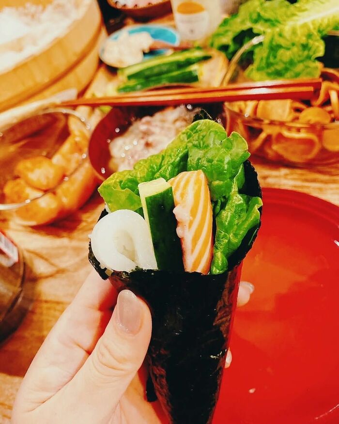 テーブルの上には、色とりどりな手巻寿司の具が並んでいます。定番のネギトロやサーモン、キュウリだけでなく、ソーセージやキムチなどもあり、バラエティー豊かな具材がラインナップ!真ん中には、寿司桶に入ったシャリがドドーンと置かれていて本格的な手巻寿司です!