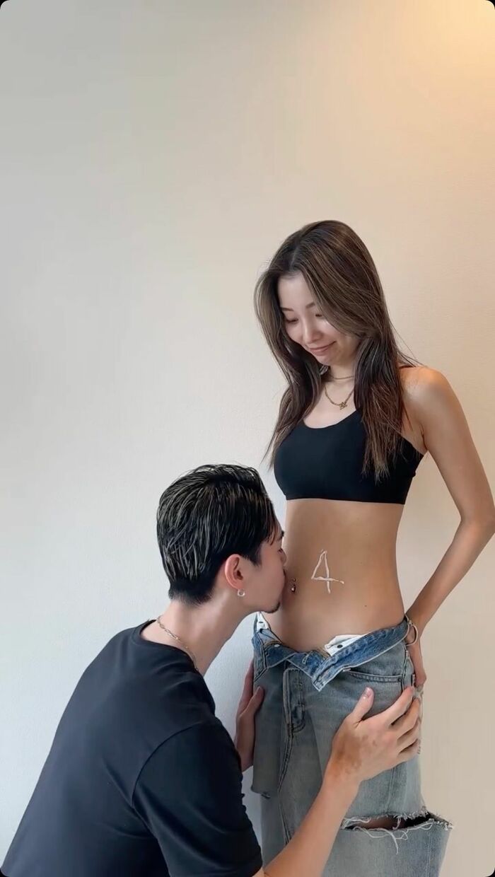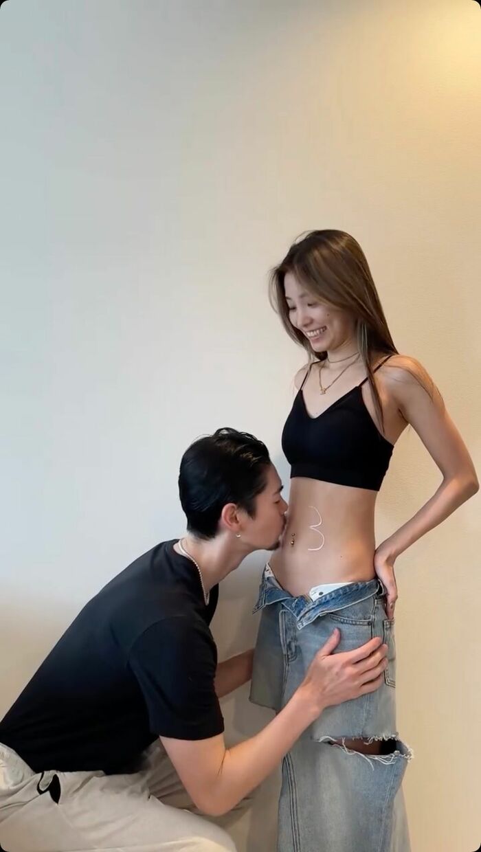 続けて、3カ月目ではまだ細いカナミさんのお腹に、フミヤさんが優しく口づけします。