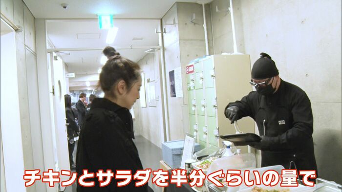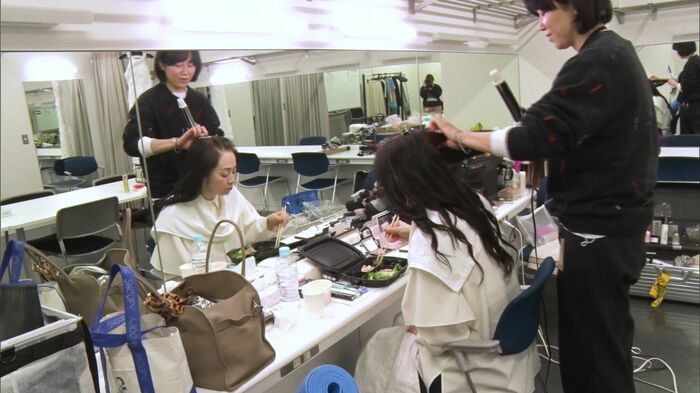 ヘアメイクをしながら食事をとる斉藤さん。この日は常に忙しい様子でした。