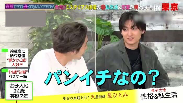 さらに「卵かけご飯大好き?」(星)、「めっちゃ当たってる!(笑)」(金子)、「家帰ったらパンツ一丁?」(星)、「僕、裸族なんですよ。パンイチです!」(金子)と、星の予想が連続で的中。さらに星の占いが繰り広げられると、その流れで金子はかつて芸能界をやめようと思っていた時期を告白。だが、星によれば、彼には来年にチャンスが来て“化ける”そう。金子は「頑張ります!」と意欲を見せていた。