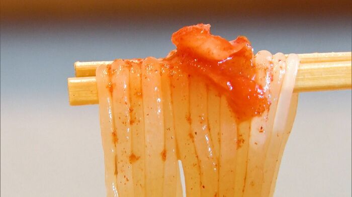 でんぷん粉と小麦粉を配合した粉に、熱湯を入れ、力強くこねて弾力のある生地をつくります。その生地を機械で絞り、茹でて、冷水で締めると、ツルンとしたコシのある麺が完成。麺の食感を楽しんでもらうため、オーダーごとに製麺をするのがこだわりだそう。