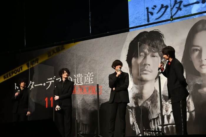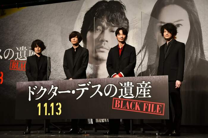 11月13日(金)より公開の映画「ドクター・デスの遺産-BLACK FILE-」のプレミアイベントが、10月5日に都内のライブハウスで行われ、主演の綾野剛と、主題歌「Beast」を担当した[Alexandros]の川上洋平(Vo&Gt)、磯部寛之(Ba&Co)、白井眞輝(Gt)が登場した。