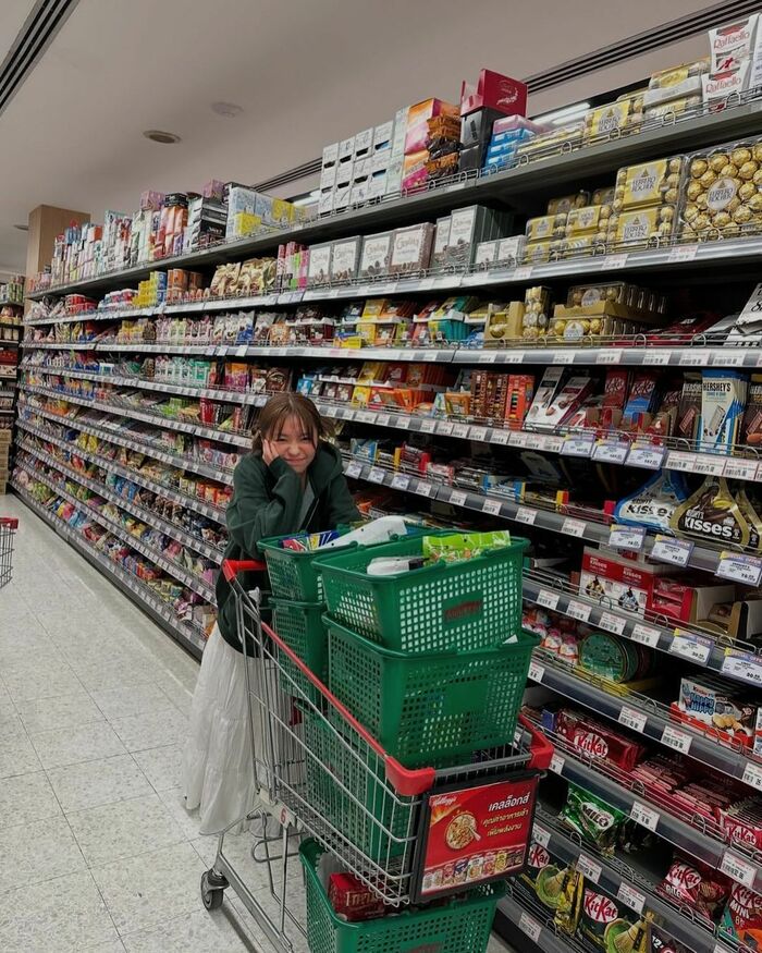 現地のお店で、カートからあふれるほど爆買いをしているショット・・・