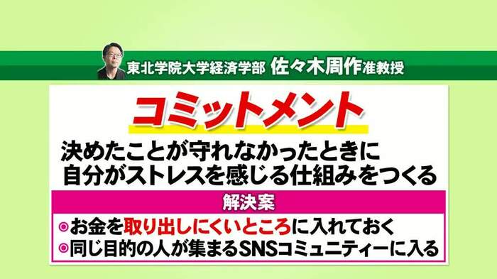 東北学院大学准教授の佐々木周作先生によると、無駄遣いを控えるために有効なのが「コミットメント」という方法。具体的には、「周囲に無駄遣いをしないと宣言する」「お金を取り出しにくい場所に置く」などの対策をすると良いそうだ。