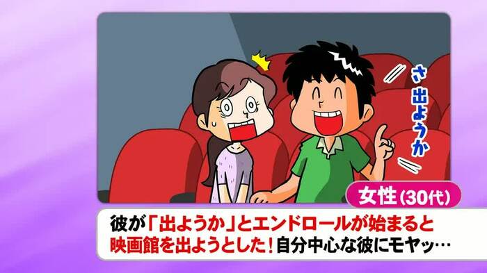 「初デートで映画に行ったが、彼がエンドロールを見ずに席を立ってしまった」「友達とお茶をしていたら、目の前で電話に出て次の予定を入れていた」という、30代女性のモヤモヤエピソードも登場した。