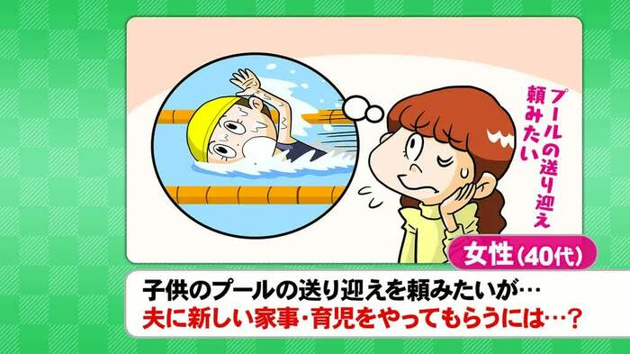 「夫は家事に協力的だが、新しい家事や育児はやってくれない。どうしたらいいのか?」という40代女性のエピソードも紹介された。