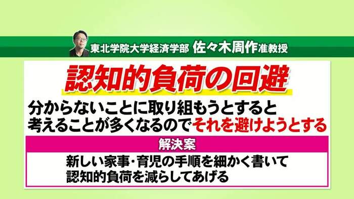 佐々木先生によると、よくわからないことから逃げようとする「認知的負荷の回避」が夫の心理に働いているのが原因だそうで、やってもらいたい家事や育児の詳細な手順を事前に提示すると、新しいことにも取り組みやすくなるのだという。