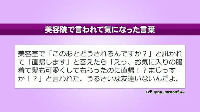 「鼻につく周りの言動」というテーマでは、「美容室で『この後どうするんですか?』と聞かれたから『直帰』と答えたら、引かれた」というSNSで話題の投稿が紹介された。