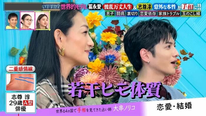 志尊さんは「そこの心配はまったくないです」と断言しますが、大串さんは「女性がいないとダメなタイプ。若干ヒモ体質。(手相に)玉の輿の線も出ていて、お金持ちのお姉さまに好かれる」と次々と鑑定。婚期は約3年後、33歳頃なのだとか。