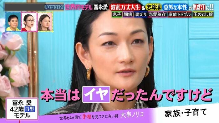 冨永さんの手相は結婚線が下降しており、「結婚すると運気が落ちる」運命だそう。「気づいてはいますよ」と笑う冨永さんに、大串さんは「大恋愛をいっぱいする。50代で本当の婚期がくる」と占いました。