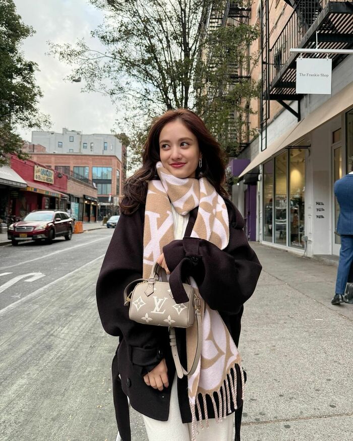 淡いピンクとベージュのカラーをしたマフラーを巻きにっこりほほ笑む姿を披露しています。
