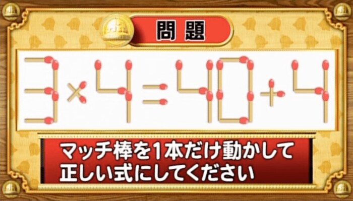 「3×4=40+4」の式から、マッチ棒を1本だけ動かして正しい式にしてください。
