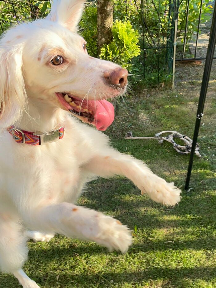 庭で遊ぶのが大好きで、跳ねながら大はしゃぎ!麦ちゃんの楽しそうな様子が伝わってきます。