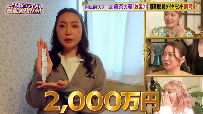 加藤さん、石田さん、小倉優子さん、住谷杏奈さん、丸山桂里奈さんの5人の奥様タレントたちが自宅を自撮りしながら、自慢のお宝を紹介。それを、スゴ腕鑑定士・三浦哲郎さんがスタジオでガチ査定しました。