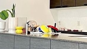 また、公開された写真をよーく見ると…料理を終えた後なのでしょうか、フライパンなど洗い終えたキッチングッズが置かれています。