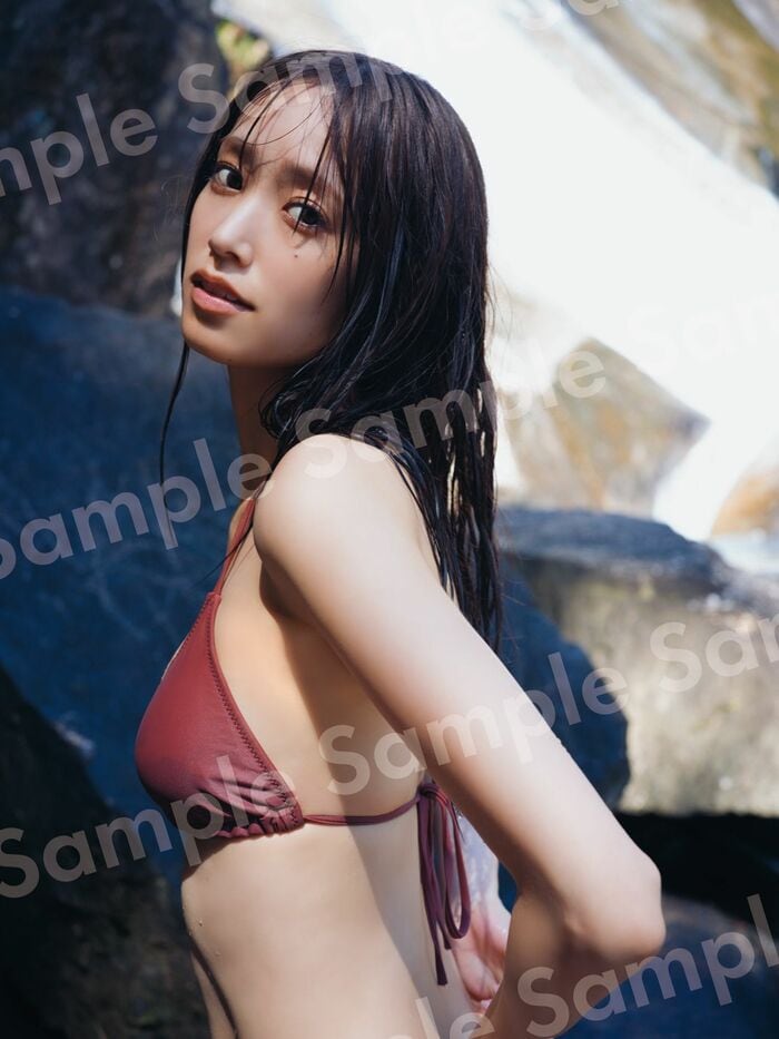 1枚目は、濡れ髪でえんじ色のビキニを纏った佐々木さん。こちらを見つめる視線は色っぽく艶やかな印象のあるショットになっています。