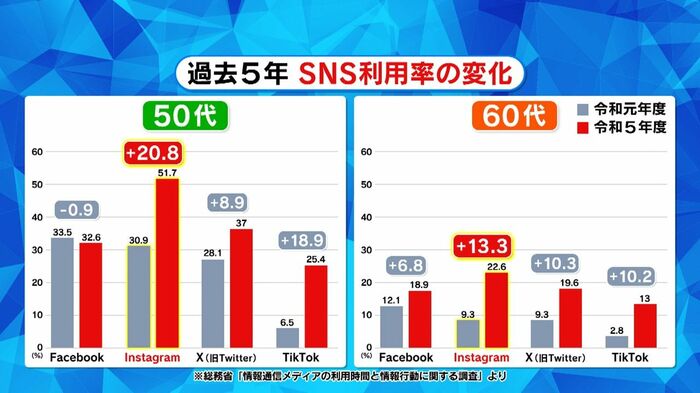 近年、SNSの中でも、インスタグラムは50代以上の利用者が増加。この5年で50代の利用率は20%以上、60代は倍以上も増えているといいます。