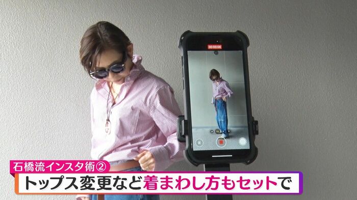 トップスを変えて着回しスタイルも撮影し、スマホアプリを使って自分で編集。