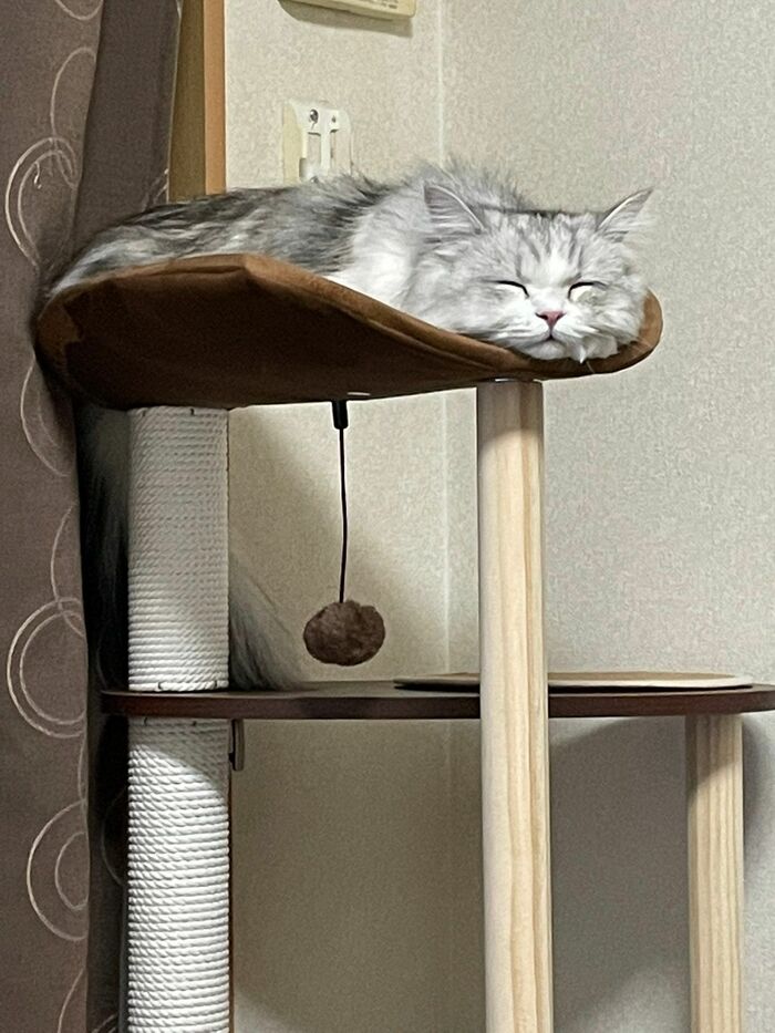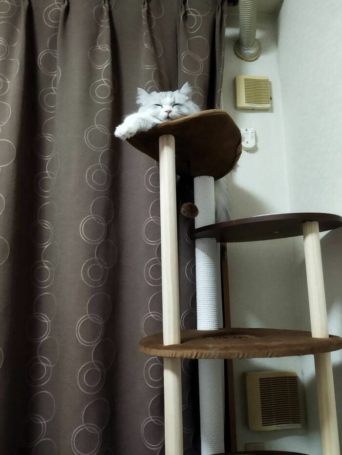 最近新しく購入したキャットタワーがお気に入りという「こはく」くんは、夕ご飯後いつもここで寝るのが日課になっているのだとか。