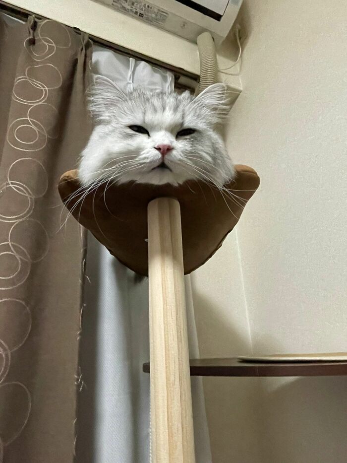 キャットタワーの上部が湾曲した形状になっていることに加え、長毛種の「こはく」くんは正面から見るとフワフワの頬毛で身体が隠れてしまうんですね。