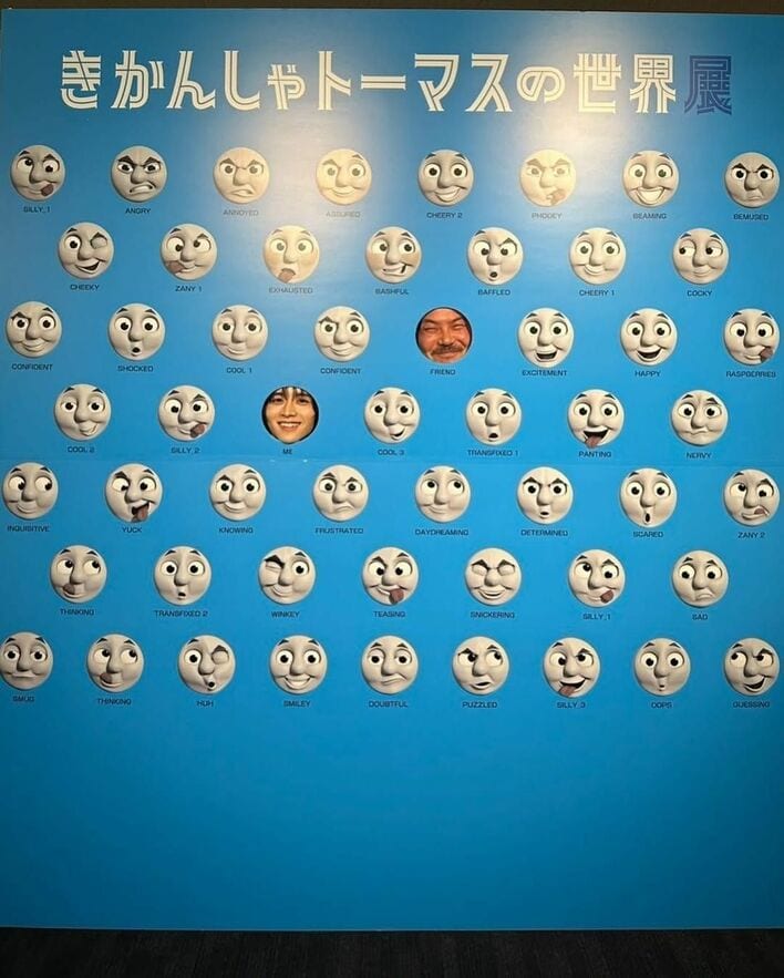 別の写真では、トーマスの顔はめパネルから、ひょこっと顔を出している板垣さんのショットも。