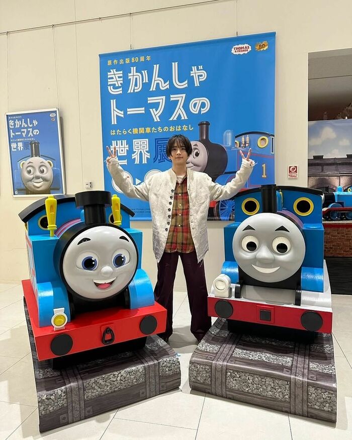 公開された写真には、チェックシャツと黒のパンツに白いジャケットを羽織った板垣さんが、2体のトーマスの展示の間に立って、誇らしげな表情でダブルピースをしている姿が!