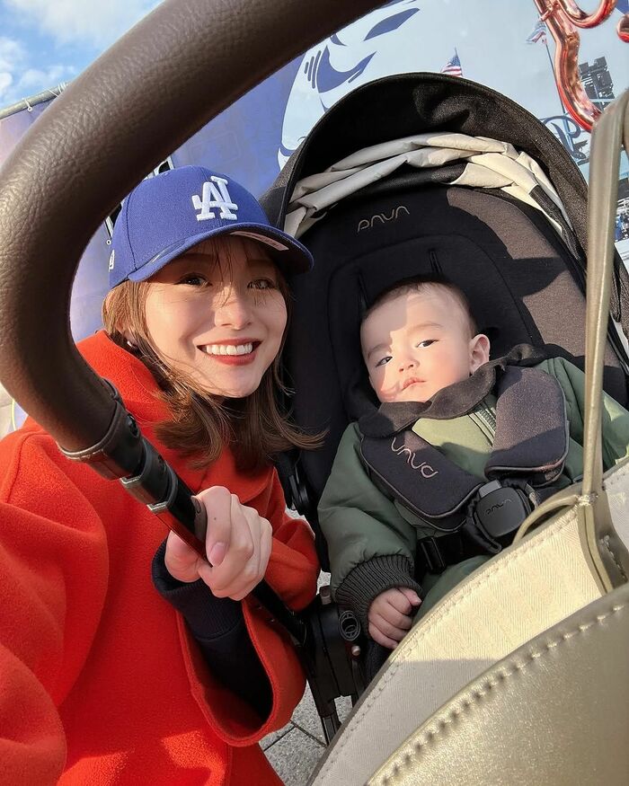 ドジャースの帽子をかぶった蜂谷さんは「パパのお仕事見学へ」とコメントし、ベビーカーの“ベビバーグ”と親子2ショットを披露しました。