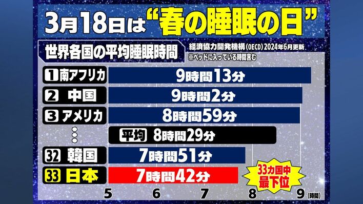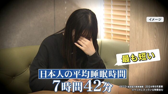 経済協力開発機構(OECD)による33カ国を対象にした調査によると、平均睡眠時間は8時間29分。しかし、日本は最も短い7時間42分と、他の国に比べて40分以上短いという調査結果になりました。