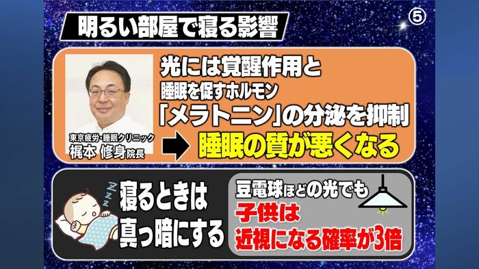 光には覚醒作用があり、また、睡眠を促すホルモン「メラトニン」の分泌を抑制するため、明るい場所で眠ると睡眠の質が悪くなります。