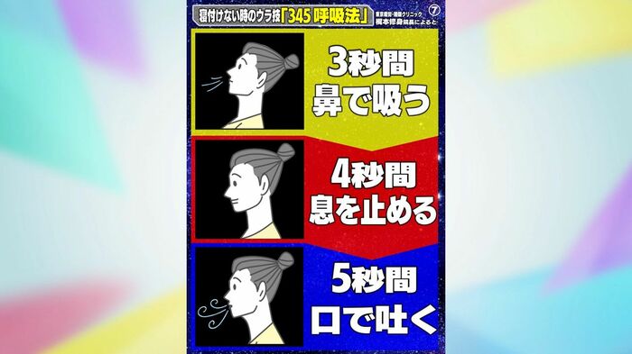 さらにベッドに横になっても寝付けない時の裏技「345呼吸法」を紹介。こちらは横になったままでもできるそうです。