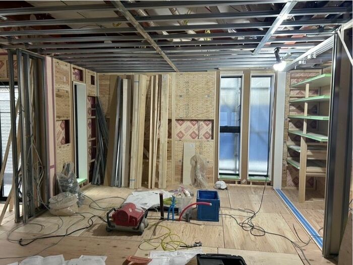 縦長の窓が付いた階段付近の様子が。どんなふうに仕上がるのか、見ている側もワクワクしてきますね。