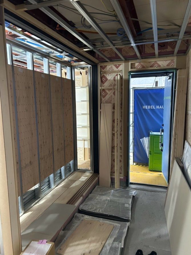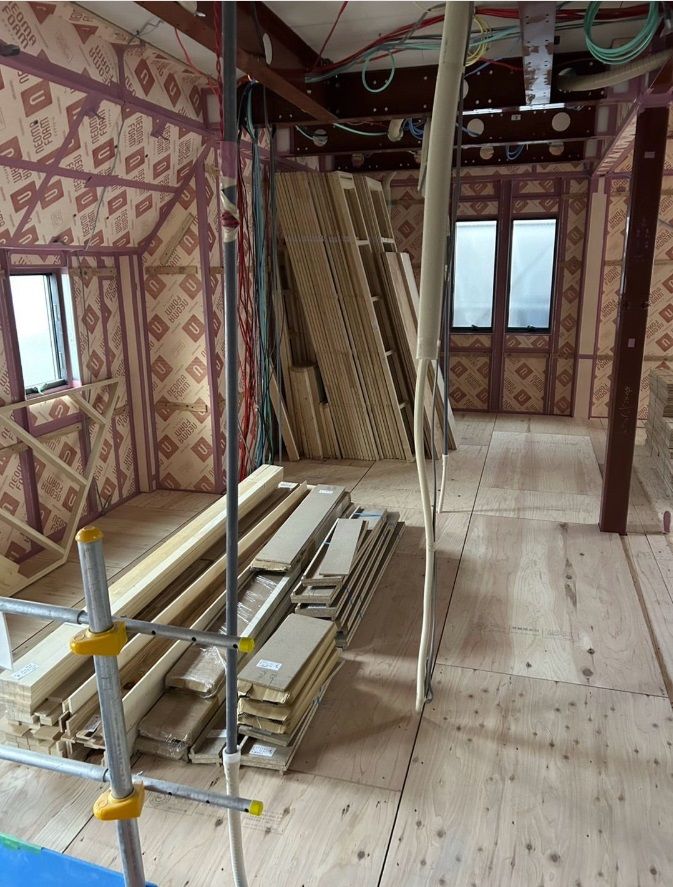 公開された写真には、木工事が始まり、大枠ができてきた玄関や…。