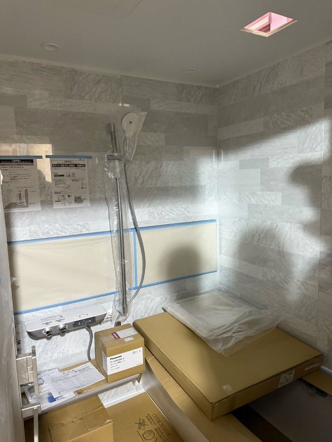 完成間近のおしゃれな色合いが目を引くお風呂場。