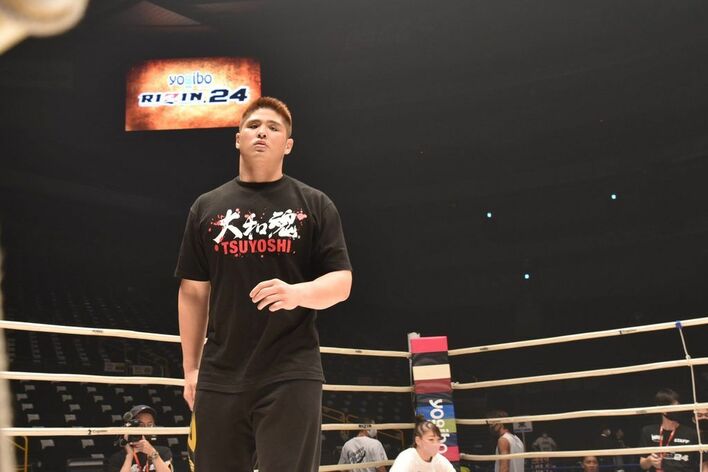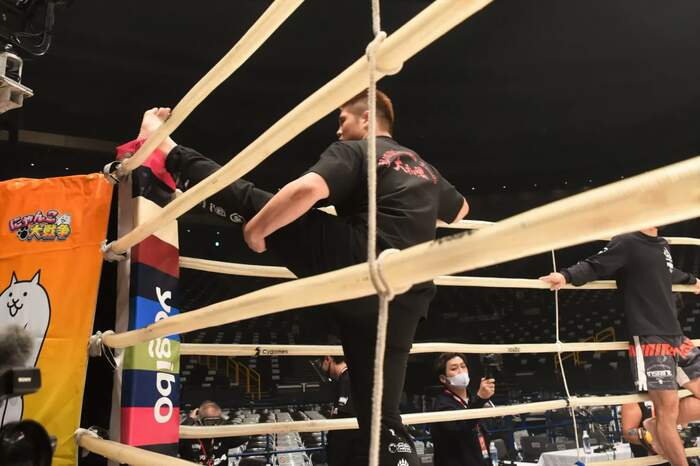 RIZIN初参戦の元貴ノ富士・スダリオ剛選手にとっては、RIZINのリングを見るのも、中に入るのも初めてのこと。リングチェックでは、最初の方はコーナーにて慎重に様子を伺いつつ、師匠のエンセン井上氏と丁寧に確認しているようだった。シャドウボクシングなどで体を動かすと、コーナーに足をかけ、大きくストレッチ。さすが元力士だけあって体の柔らかさは健在のようだ。