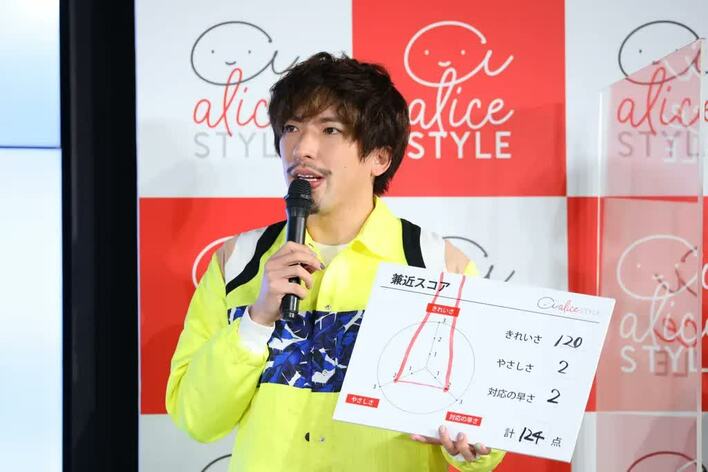 ここで、新サービスのユーザ評価制度「アリススコア」を用いて、お互いを「きれいさ」「やさしさ」「対応の早さ」の3点で採点し合ってもらうことに。