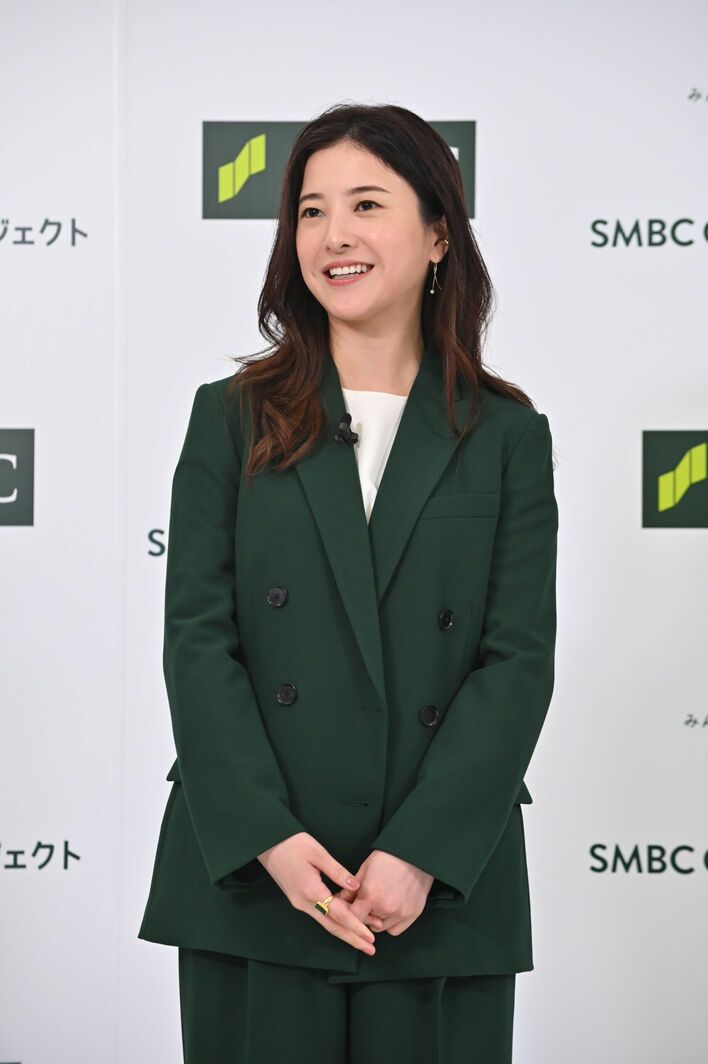 MCと三井住友銀行のマスコットキャラクター、ミドすけが迎える中、吉高が登場。ひと言挨拶をすると、衣装で着てきたSMBCカラー(深緑)のセットアップの話に。吉高は「すごく一生懸命探してくれたみたいで、より近い色のスーツを着させていただきました」とコメントし、バックパネルにあるロゴの色と比べ「バッチリですね」と微笑んだ。