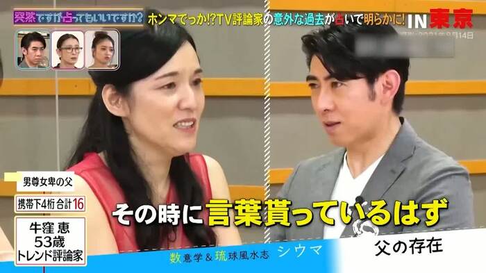 さらにシウマは、「36〜37歳の頃、旦那さんに、“今にも生きる言葉”をもらっているはず」とかなりピンポイントに診断。スタジオの水野美紀も「なんでわかるの!?」と驚きの声が上がるなか、牛窪は心当たりがあるようで「その頃からメディアに出るようになって、すごい嫌がらせも来るようになって、辞めたいと思ったんです。そしたら夫に『じゃあ、なんのために仕事してるの?そんなことで辞めたら一生後悔するよ』と言われて、“この人すごい人だ”と思いました」と話していた。