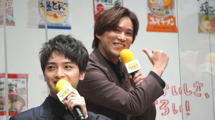 「アボカドチーズの塩とんこつらーめん」について、藤ヶ谷は「すぐ食べたい、あれ」、横尾は「イタリアンになるのは、すごい。花束みたいです」とオシャレなコメントをしていた。「アドリブが多かった?」と質問が飛ぶと、玉森は「台本どおり」、千賀は「『あざっす』も台本です」とドヤ顔で明かし、笑いをとっていた。