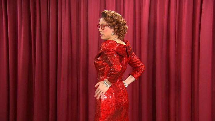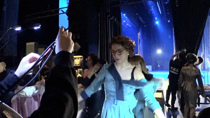 上演後にドロシーの姿のままインタビューに答えた山崎さん。