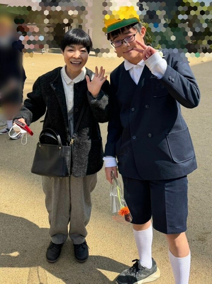 ブログで公開された写真には、白のブラウスとグレーのパンツに黒いコートを着た山田さんと、ネイビーの制服姿で右手に花を持ちながら隣に並ぶ長男の姿が!