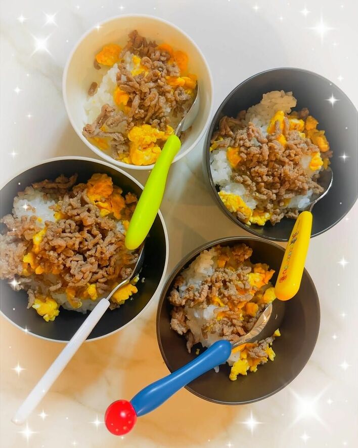 公開された写真には、“バンビーノくん”が作ったという、そぼろと卵をご飯にのせた2色丼や…