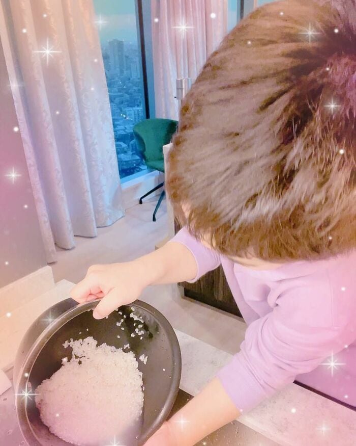 そんな長男に、新たにご飯の炊き方を教えたという平さんは、息子が米とぎをしている様子も公開!