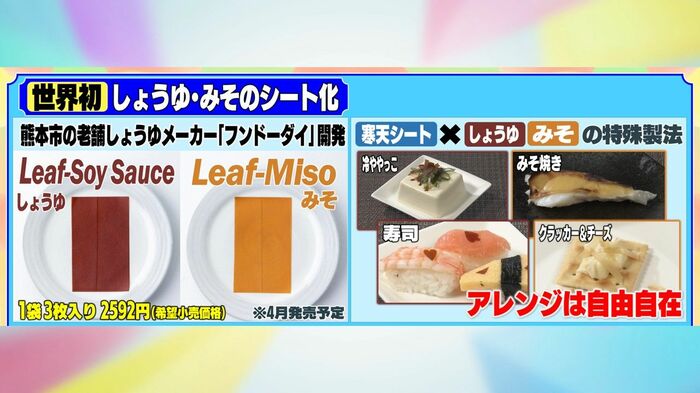 熊本の老舗醸造メーカー「株式会社フンドーダイ」は、世界初の特殊製法で、日本食に欠かせない「しょうゆ」と「味噌」のシート状製品の開発に成功!