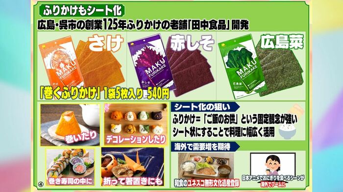 広島・呉市の創業125年のふりかけの老舗「田中食品」が開発した、「巻くふりかけ」は、「さけ」「赤しそ」「広島菜」の3種類が販売。
