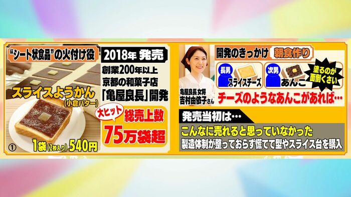 シート状の食品が広く知られるようになったきっかけは、京都の老舗和菓子店「亀屋良長株式会社」が2018年に発売した、「スライスようかん(小倉バター)」。