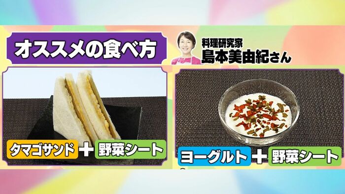 料理研究家の島本美由紀さんによると、卵サンドにやさいシートを挟んだり、ヨーグルトにやさいシートを刻んで乗せるという食べ方もオススメだそうです。