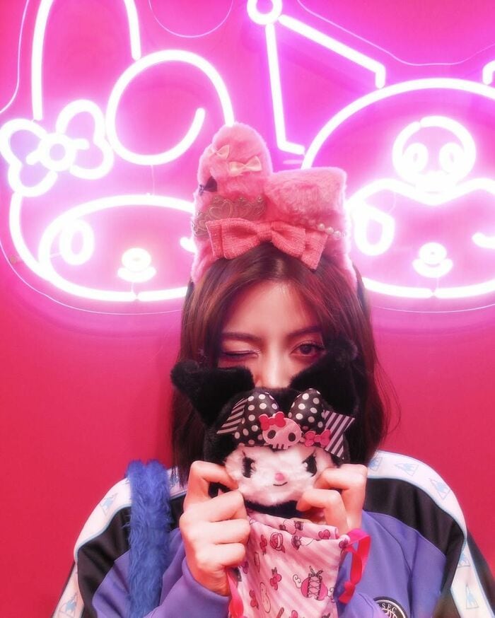 マイメロディのカチューシャ、手にはクロミのぬいぐるみと、サンリオキャラクターたちに囲まれ、楽しいひとときを過ごした様子でした。