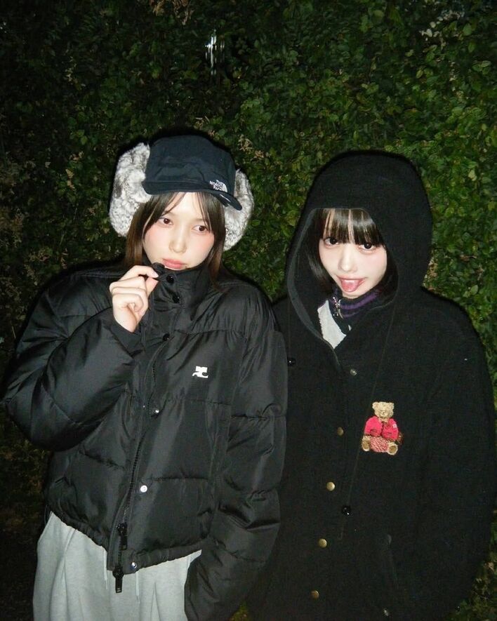 黒いアウターにスウェットパンツ姿の本田さんの隣には、黒のアウターのフードをかぶり「べ~」と舌を出すあのさんの姿が!