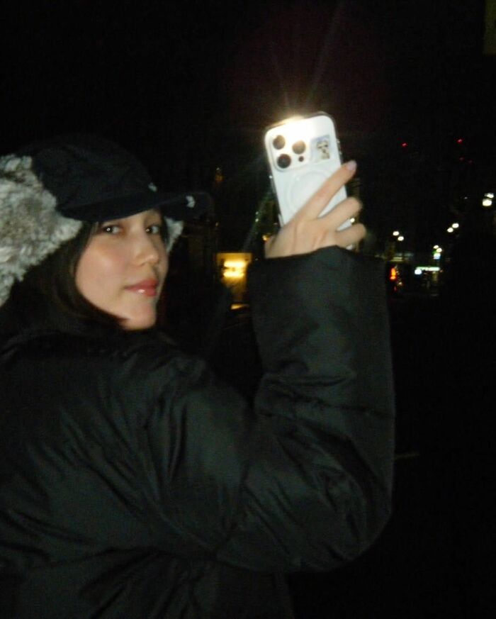 また、あのちゃんが撮影したのでしょうか、夜道を歩く本田さんの姿も!ふわふわな帽子もおしゃれに着こなし、防寒対策もバッチリです。